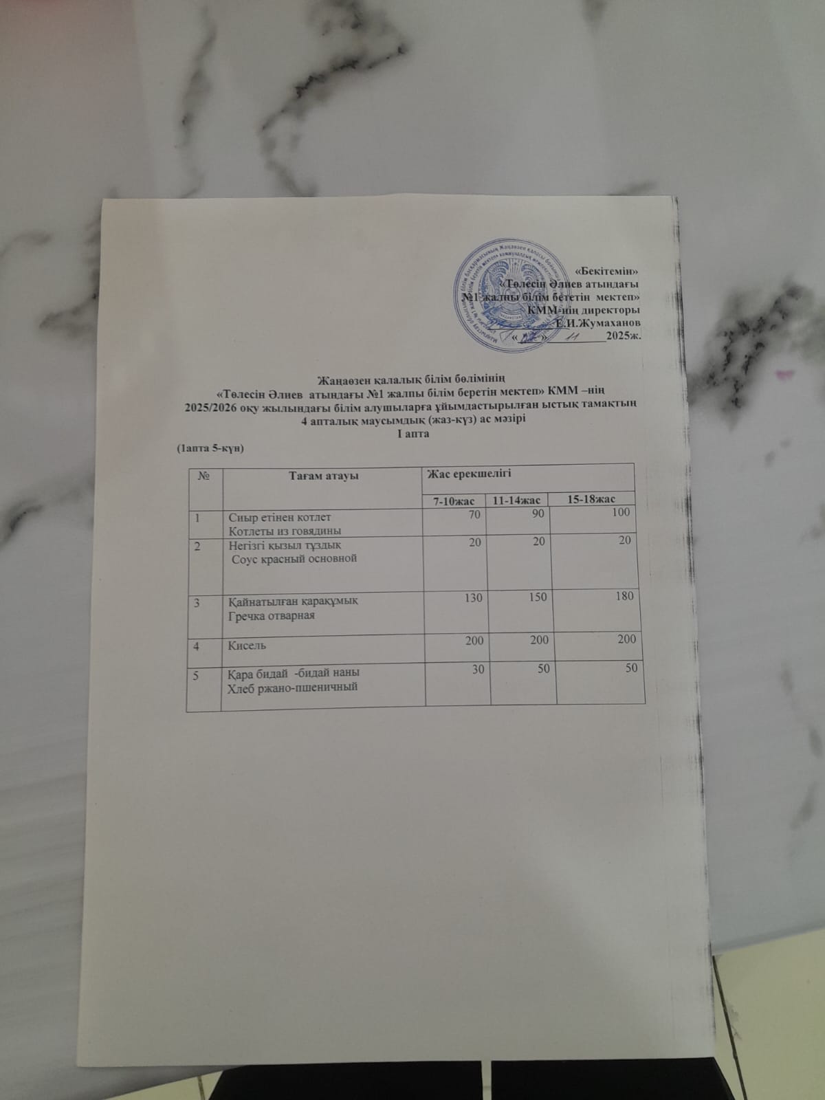 №1 жалпы білім беретін мектеп» КММ – де 07.11.2025 жыл күнгі оқушыларға ұсынылған ас мәзірі