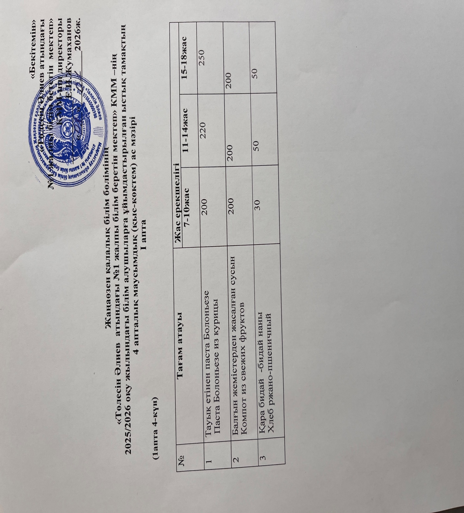 №1 жалпы білім беретін мектеп» КММ – де 08.01.2026 жыл күнгі оқушыларға ұсынылған ас мәзірі