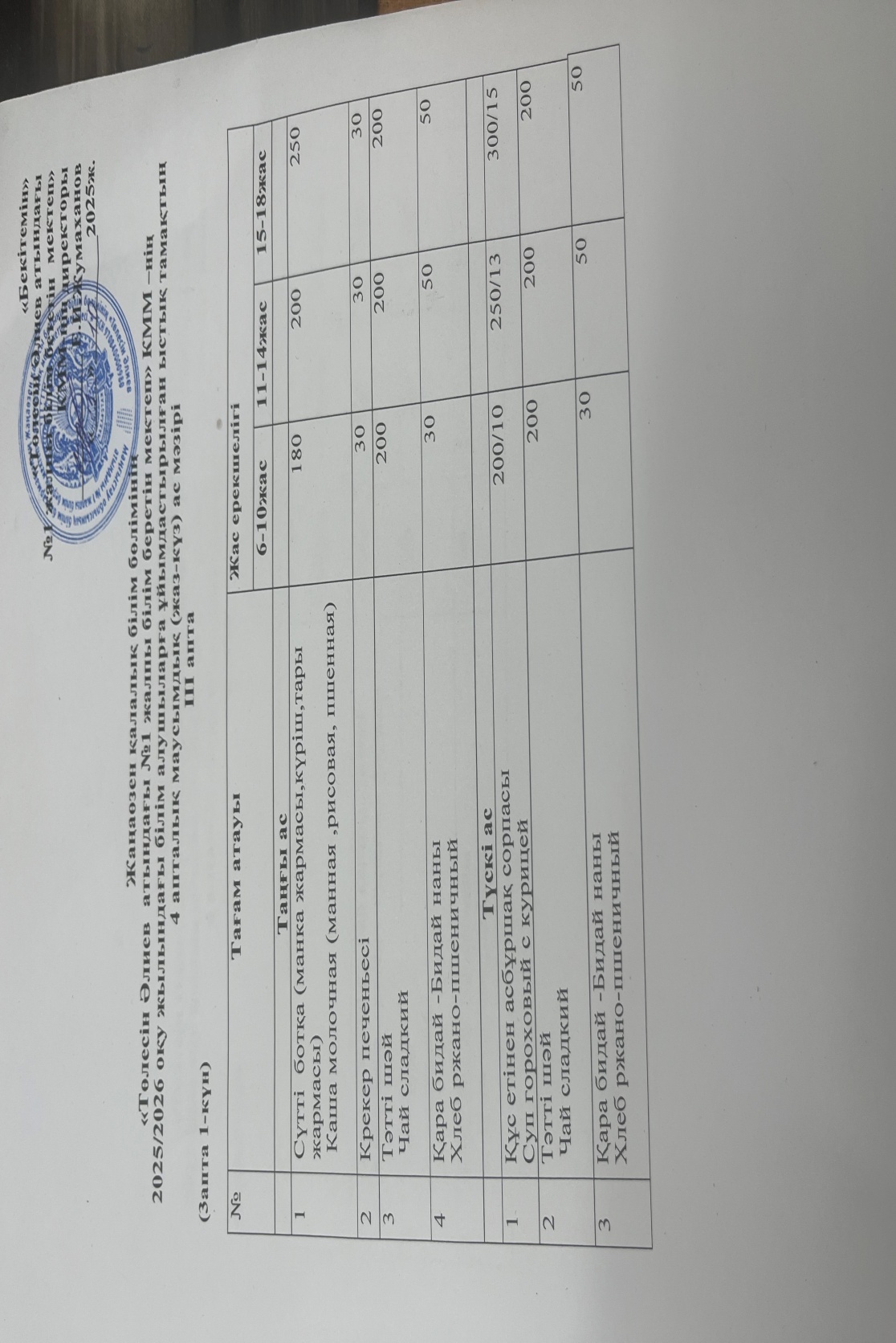 №1 жалпы білім беретін мектеп» КММ – де 13.10.2025 жыл күнгі оқушыларға ұсынылған ас мәзірі